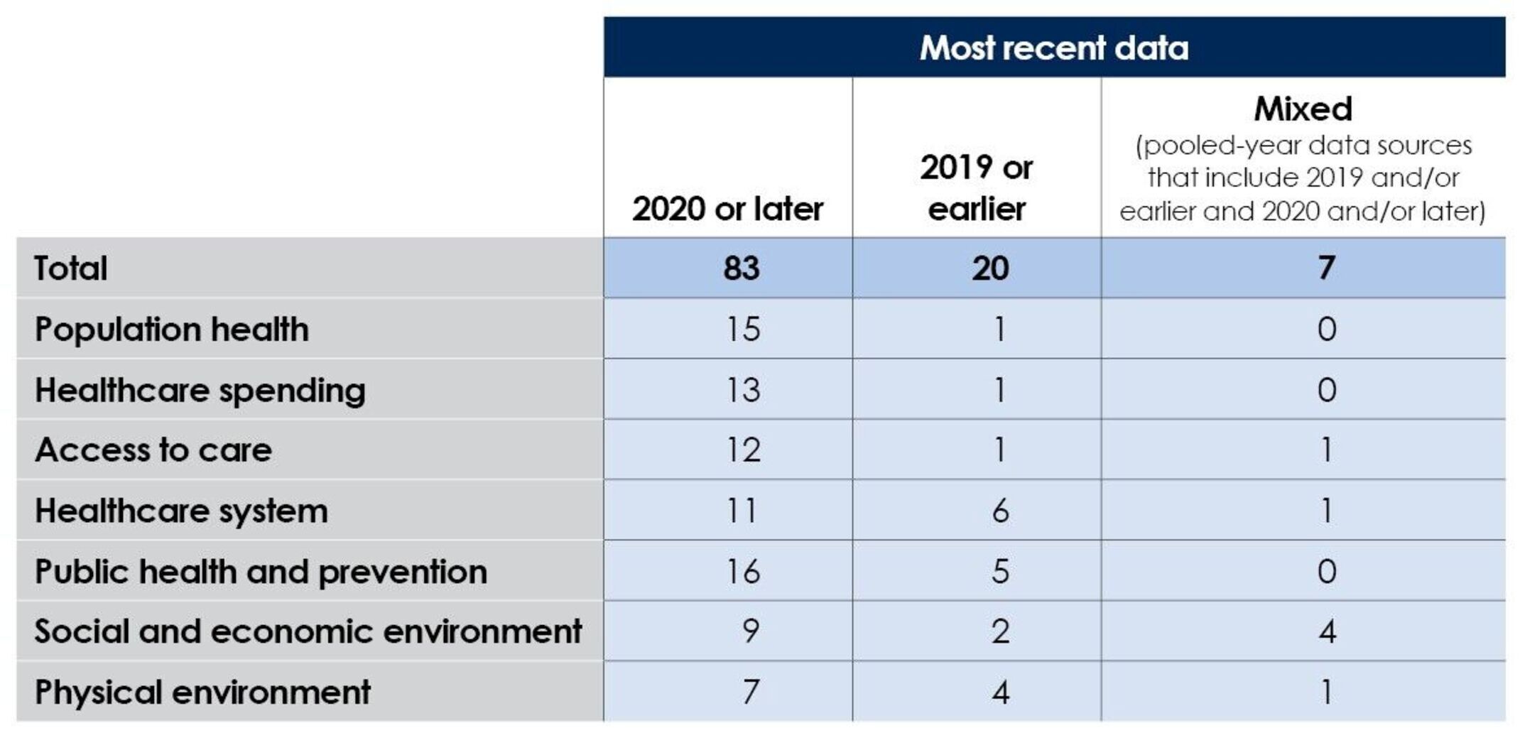 HPIO compiled the most recently available data for the Dashboard. In most cases (75% of metrics), the most-recent data presented in the domain profiles is from 2020 or later, meaning that it captured the time period after the pandemic was declared. However, some data was only available for 2019 or earlier. The table below describes the number of metrics in the Dashboard, by recency of data and by domain: