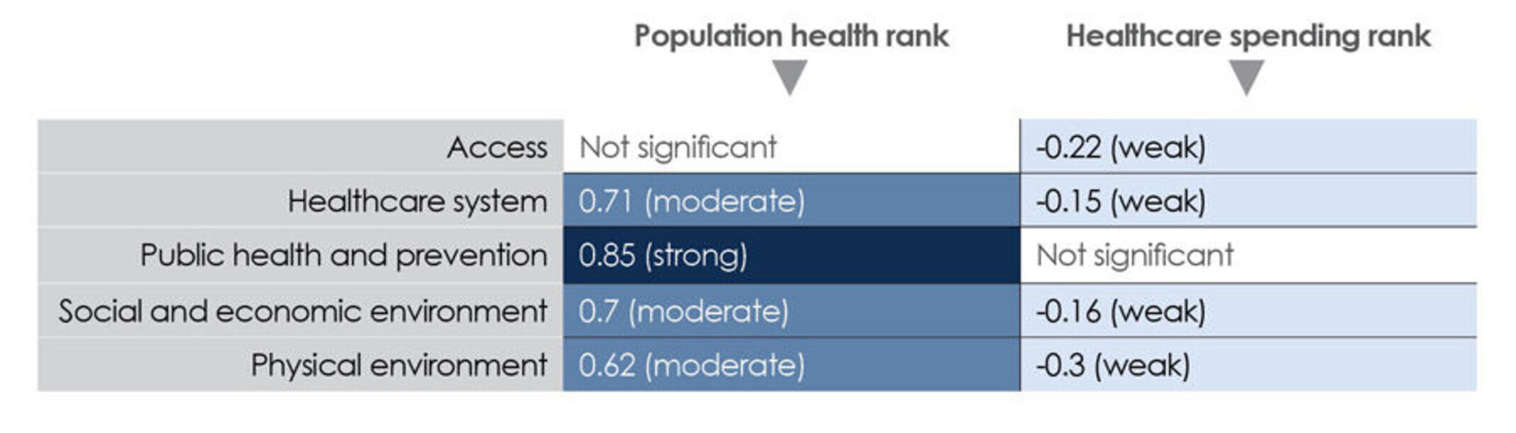 The public health and prevention domain was strongly correlated with population health, while healthcare system, social and economic environment and physical environment were moderately correlated with population health. Correlations between most domains and healthcare spending rank were weak and negative, indicating a weak inverse relationship between performance on the access, healthcare system, social and economic environment and physical environment domains and healthcare spending.
