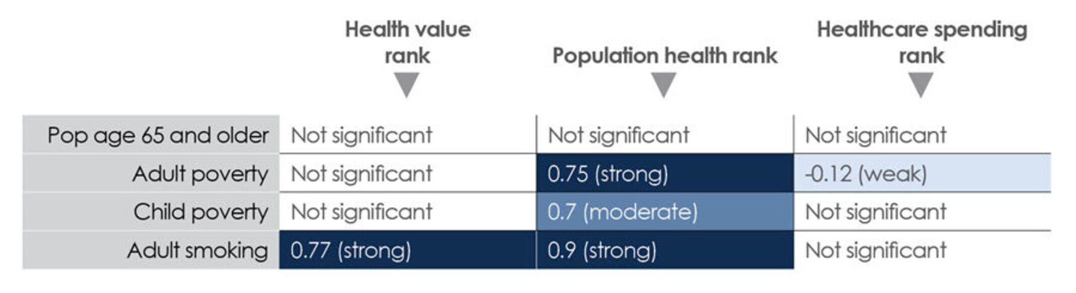 HPIO ran a series of correlation analyses to determine the strength of relationships between specific factors and health value rank, population health rank and healthcare spending rank (displayed in the table). HPIO generally considers a correlation with a correlation coefficient (r) of 0.75 or higher to be strong, 0.5 – 0.75 to be moderate and below 0.5 to be weak. However, even a strong correlation does not suggest a causal relationship.