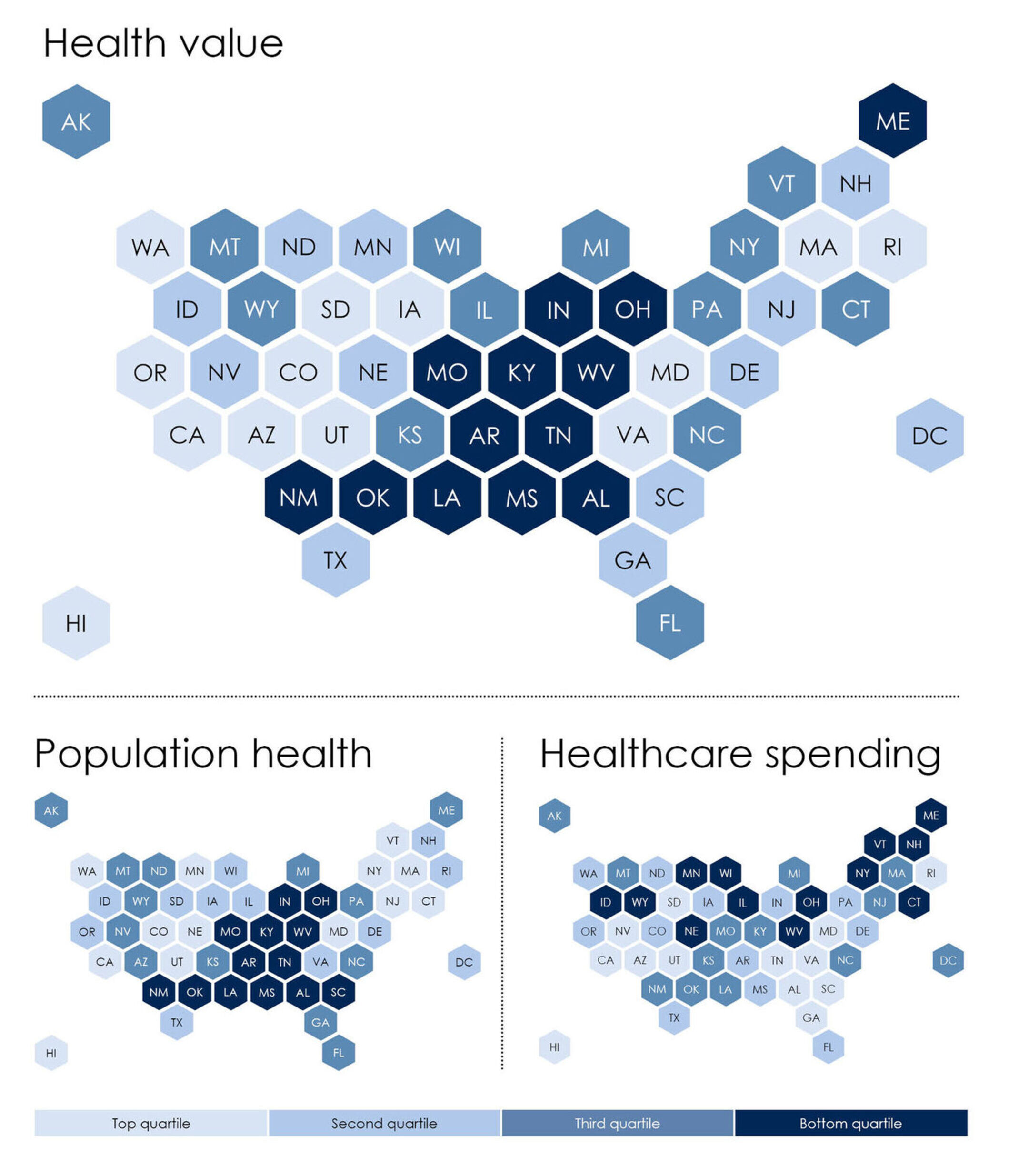 - Four states are in the top quartile for both population health and healthcare spending: Hawaii, Utah, California and Maryland.