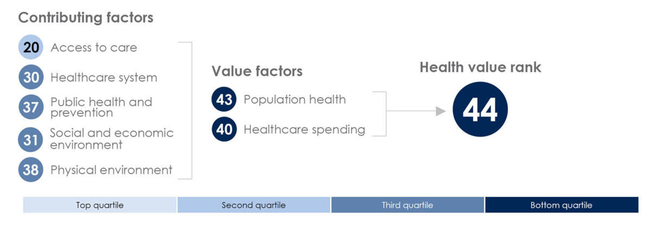 - Health value is calculated by equally weighting population health and healthcare spending metrics. The diagram below shows Ohio’s rank on the value factor domains (population health and healthcare spending), which are combined to calculate Ohio’s rank on health value.