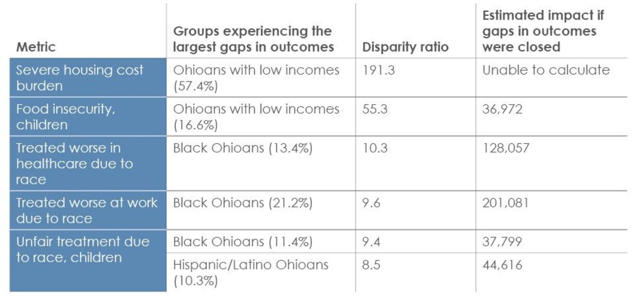 Disparity ratios displayed in the 2023 Dashboard equity profiles were calculated by dividing the outcome (e.g., rate or percent) of comparison groups (i.e., groups that consistently experience worse outcomes and are systematically disadvantaged) by the outcome of the reference group (i.e., the group that most consistently experiences the best outcomes and is systematically advantaged). For example, the unemployment rate for Black Ohioans (comparison group) is 10.6%. The unemployment rate for white Ohioans (reference group) is 4.3%. The Black-white disparity ratio for unemployment is 2.5. This means that the unemployment rate for Black Ohioans is 2.5 times higher than the unemployment rate for white Ohioans.