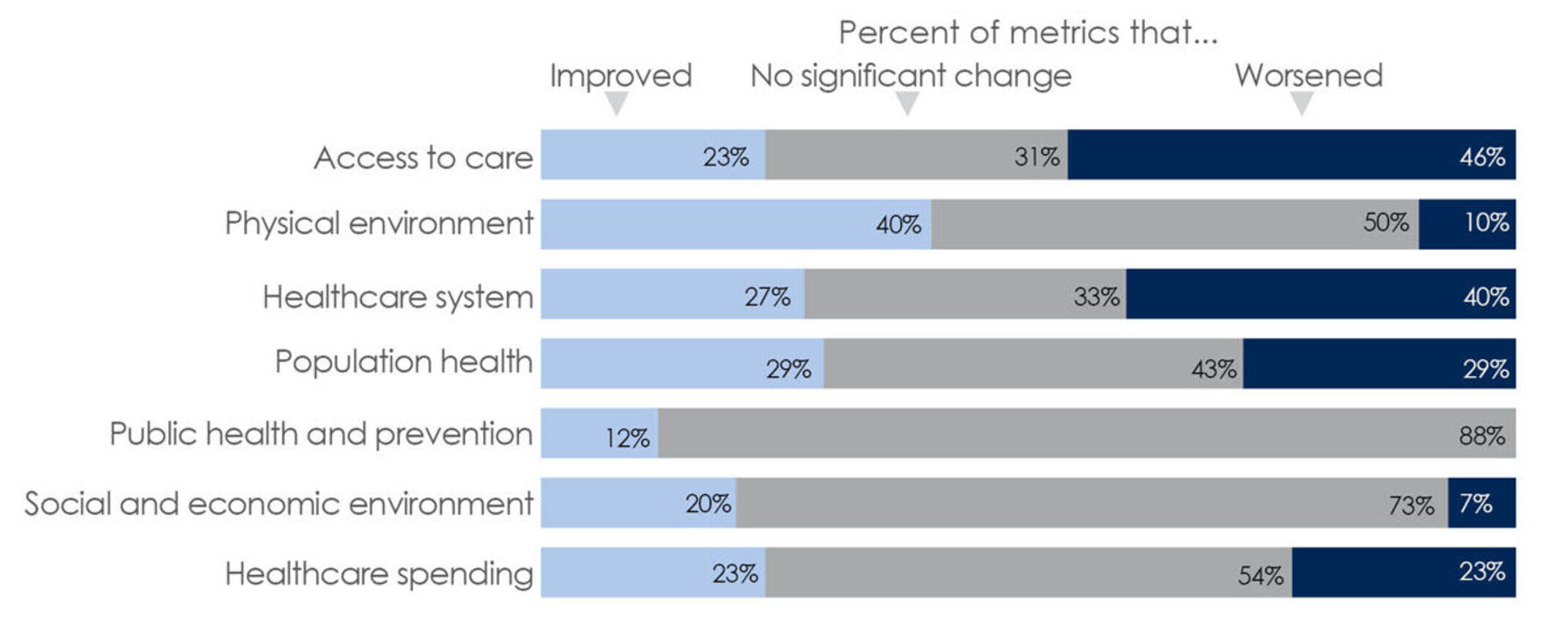 - As shown in the graphic below, the physical environment domain had the highest proportion of metrics that improved, while the access to care domain had the highest proportion of metrics that worsened.