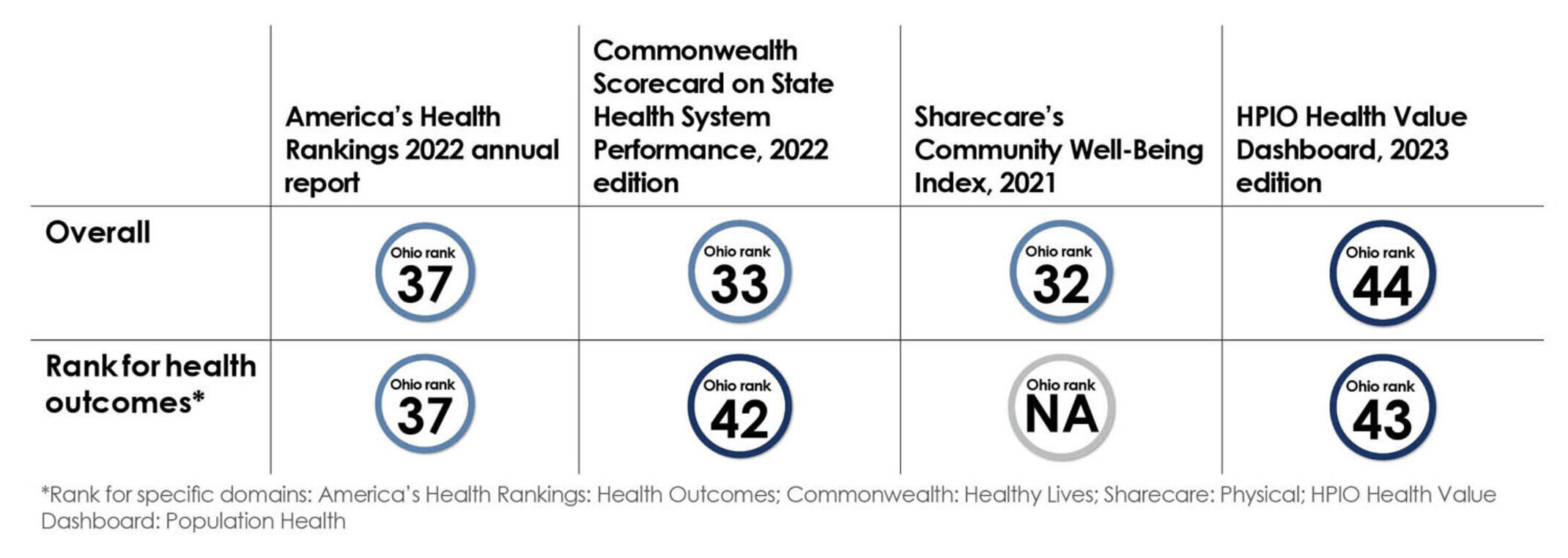 - Ohio’s health value rank is 44 in the 2023 edition. Ohio’s rank in the 2021 edition was 47. Because the metrics that go into the health value rank have changed in each edition, caution should be taken when comparing Ohio’s health value rank across editions.