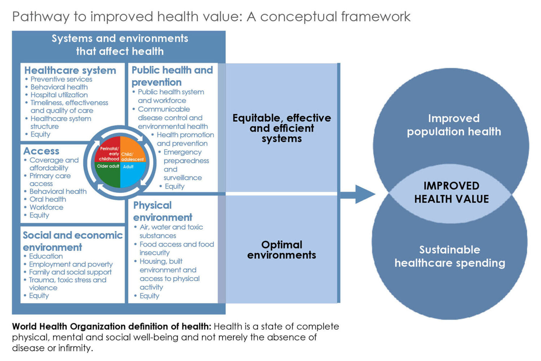 The Dashboard is based on the Pathway to Improved Health Value conceptual framework (below), created in 2013 with input from HPIO’s Health Value Dashboard Advisory Group. The framework defines health value and outlines the systems and environments that affect health. The Dashboard includes metrics related to these various systems and environments, including access to care, healthcare system performance, public health and prevention, social and economic environment and physical environment.