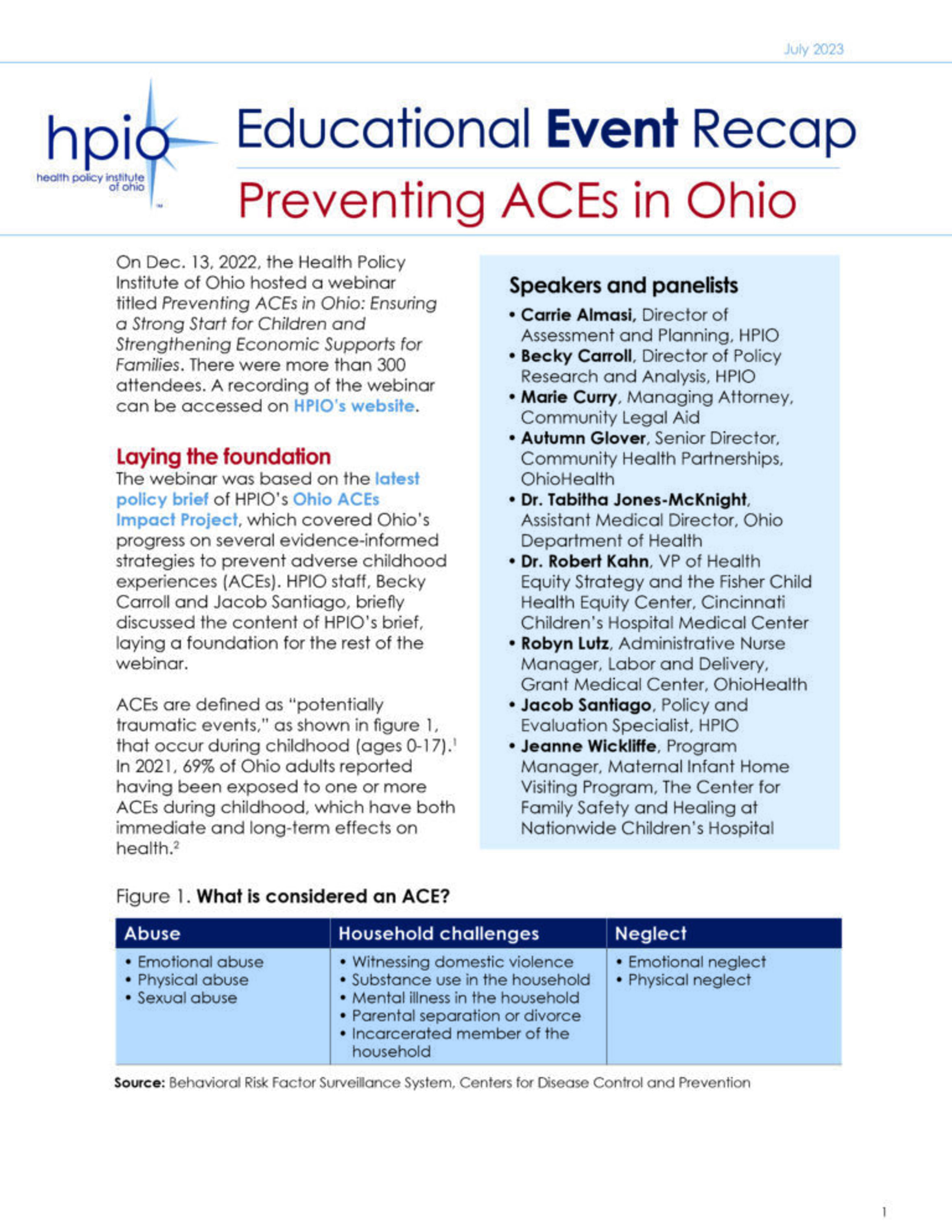 - HPIO Policy brief: “Strategies to prevent Adverse Childhood Experiences (ACEs) in Ohio: Ensuring a strong start for children and strengthening economic supports for families“