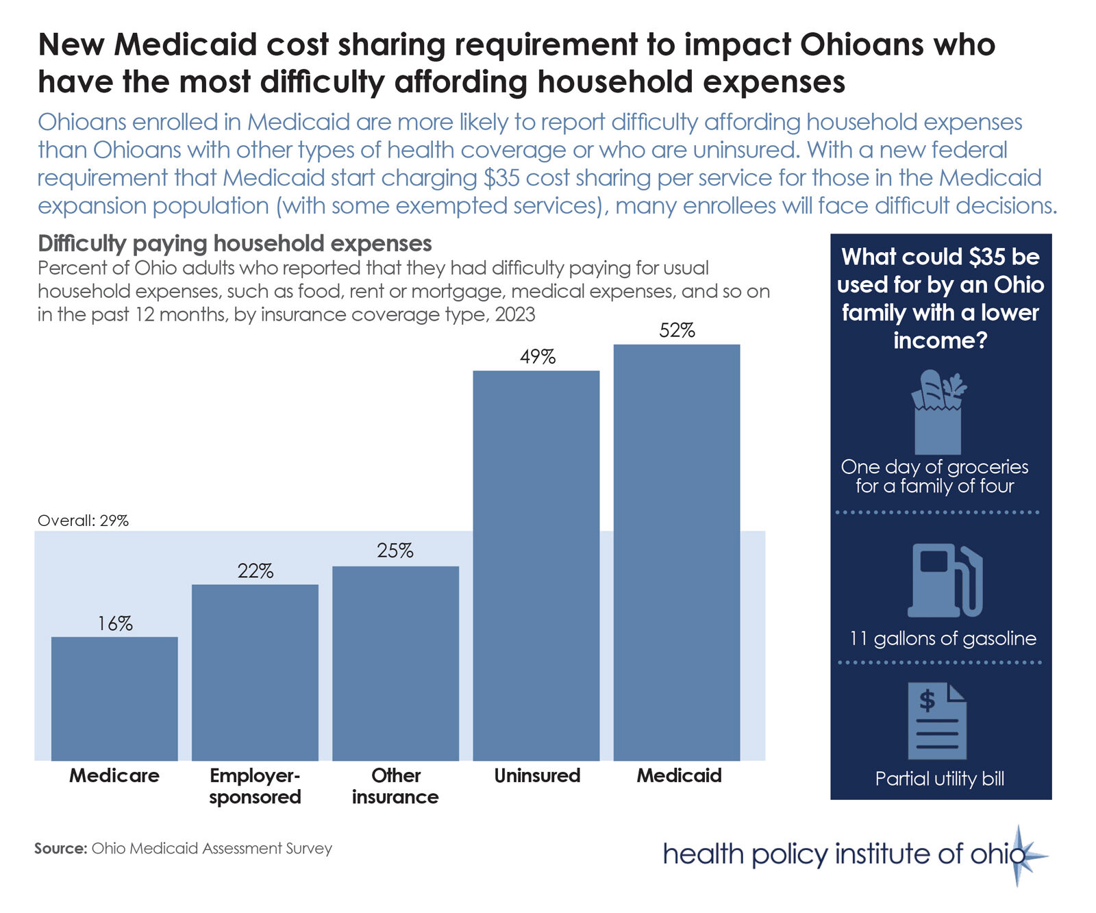 As illustrated above, Ohioans who are enrolled in Medicaid are more likely to report difficulty paying household costs, such as food, housing and medical expenses, than those with other forms of insurance or those who are uninsured.