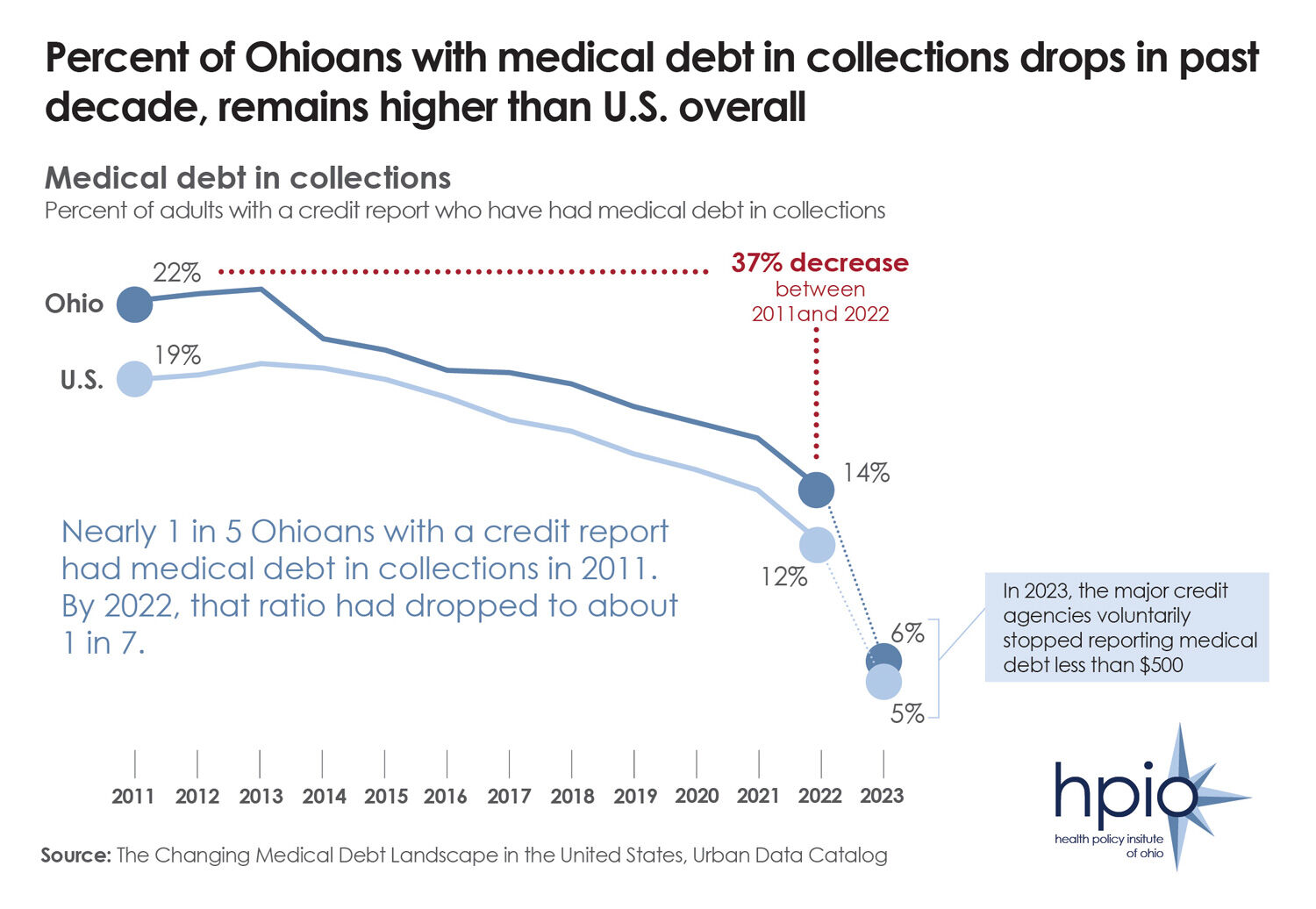 The percent of Ohioans with a credit report that includes medical debt dropped by nearly 40% from 2011 to 2022, although the percent remains higher than the U.S. overall, as illustrated above.